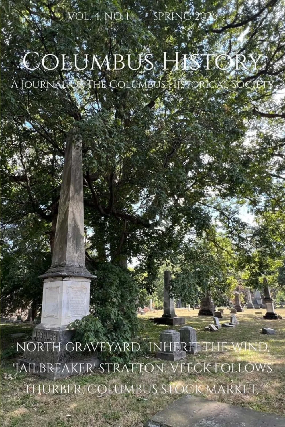 This issue includes articles about the history of Columbus, Ohio, and surrounding areas. In this issue, Columbus History editor Bob Hunter has three articles on the old North Graveyard, which was located in what is now the Short North section of the city before most of the remains were removed in the nineteenth century; Doug Tracy has a story on Clyde Felix Stratton, the "prince of jailbreakers,' who escaped from the Ohio Penitentiary twice and more than 60 jails in all; Jim Tootle has an article on the 76th anniversary of three-foot, even-inch Eddie Gaedel batting for the St. Louis Browns in 1951, a stunt that was eerily similar to a story written by Columbus native James Thurber years earlier; Christophe A. Amatos has a story on the little known Columbus Stock Market, that operated for 31 years and has all but been forgotten today; and Nena Couch had a story about the play Inherit the Wind, which was modeled after the famous John Scopes trial by two writers Jerome Lawrence and Robert E. Lee., who had backgrounds with Ohio State and Ohio Wesleyan.